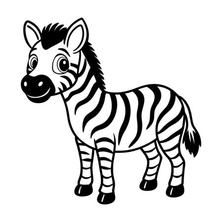 This black-and-white illustration of a zebra showcases its iconic stripes and a cheerful expression. Featuring bold line art, detailed features, and a playful design, this zebra is perfect for enhancing digital artwork, crafting projects, and prints. Bring the charm of the savanna to your creations with this lovable zebra character.